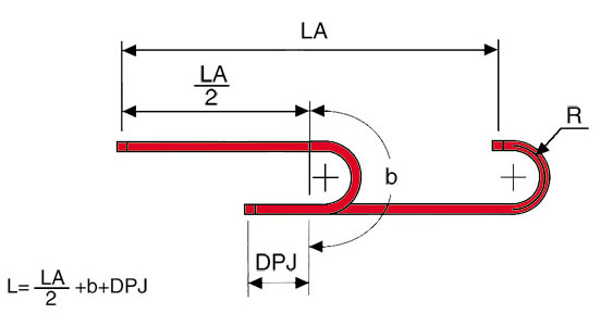 The chain length(L) is calculated by summarising the half stroke LA/2 to the nominal value(b) of the bending radius and the distance()DPJ from fixed point to center of total stroke.