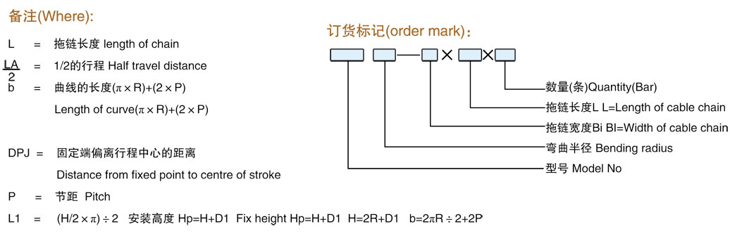 拖鏈長度的計算取決于LA/2中心點到彎曲半徑的距離,DPJ表示固定端偏離中心點的距離,這個值(b)會隨著拖鏈節距的變化而變化,適用于尼龍拖鏈和鋼鋁拖鏈。